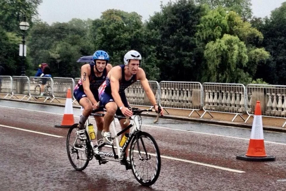 At 2:05pm, “BANG” the gun went off and we were off. We had practiced getting out quick to get away from the traffic and potential tangling with other athletes. We got out in the open very quick but young British Paralympic swimmer also started quick. We remained to his right but as we approached the first buoy they began to pull ahead and rounded the turn ahead of us. On the back stretch they put even more distance into us as we passed swimmers from the wave ahead of us. I of course could not see how far he was so I just put my head down and focused on keeping my form. We made the left hand turn around the last buoy and pushed it hard to the blue exit ramp. As we ran to transition I asked Colin how far he was ahead and he wasn’t sure. We entered the muddy transition area and as we made the right hand turn to run down our aisle, I slipped on the muddy slip and slide and Colin followed suit slipping as well. We quickly got up but this cost us a few more seconds. We had swam a 10:38 and Brit David Ellis swam a 10:02. With our fall in transition area he gained 15 more seconds on us.