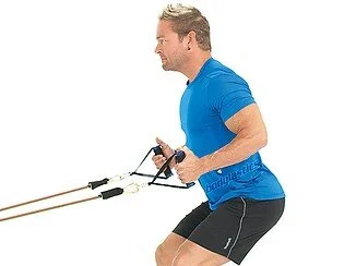 3. Upright Rows & W's: Keeping the swim stretch cords in hands, stand upright, and keep shoulders back with elbows directly at sides. Pull straight back while squeezing shoulder blades together to work your rhomboid muscles. After completing this exercise, pull back to get resistance on the tubing just until elbows are alongside your body and then rotate hands out to the side simultaneously to create a "W" shape with your arms. Focus on keeping your shoulders squeezed back as you use rotator cuff muscles to rotate your arm out.