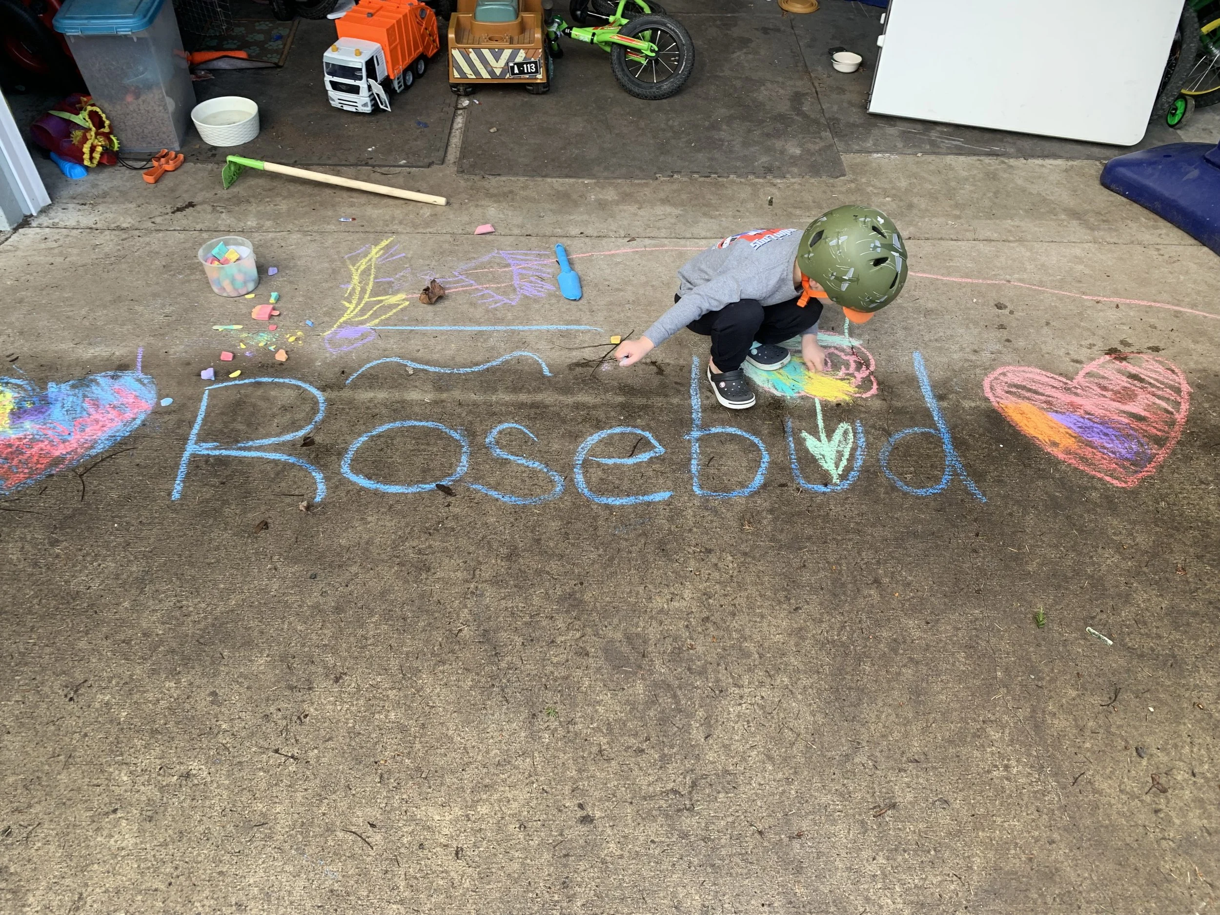 Getting ready for her arrival, the two boys helped chalk Rosebud on our driveway with two colored hearts, one on each side in the day prior to her coming home. Kennan is seen coloring in a rose that we drew stemming from the letter “U” in Rosebud.